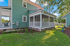 This screen porch add-on in New Bern's historic district was commissioned by the owners of this house so they could enjoy the view of their yard and the North Carolina weather in a cozy and controlled space. The plans were drawn and submitted to New Bern's Historic Preservation Commission, and they were subsequently approved for their authentic appearance and fluid transition into the original structure. The interior was furnished to match the owners' fun tastes with furniture that suits the space. This add-on turned out to be an exemplary project, perfectly fitting into the historic district's atmosphere despite using more modern techniques, all while being decorated in the way the clients wanted.