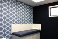 Coastal Children’s Clinic, New Bern, NC. This project was a complete interior design makeover of a functioning 7 day a week pediatric office. Our team put together a complete interiors package including carpet, paint, counter-tops, tile, lighting, acoustic and vinyl wallcoverings and then completed the construction of the project. The design was constructed around the idea of playful colors without bringing in specific child related themes. These custom murals were designed to bring all the colors of the project together in a playful wave. They are lit with led lights woven into the mural. Each piece individually cut, painted and formed together to create a cohesive whole. Each exam room has one of four different vinyl wall coverings which blend in with the color pallet. A tile boarder was added in each of the toilet rooms with metallic paint below. Lighting fixtures were installed at the front counter adding some overhead visual interest.