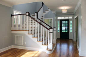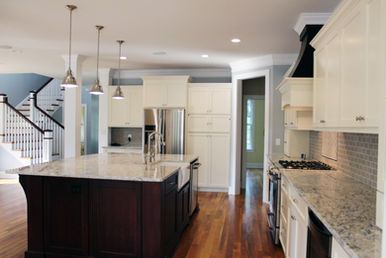 This lovely new home is situated on a high corner lot in Trent Woods overlooking a Trent River water access. The house is designed around a large central kitchen, living, and dining space connected by an enclosed walkway to a two car garage and golf car garage. The large island in the kitchen is a gathering focal point and is flanked by two columns leading to the living room. The stone fireplace brings a modern yet warm feel to the space and leads out to a screened in porch and expansive side porch overlooking the water. The master bedroom has it’s own screened porch and large master bath with tiled shower and tub. Up stairs are two rooms with an over sized Jack and Jill bathroom and extensive attic space which can be finished at a later time. Pope Custom Homes constructed the house.